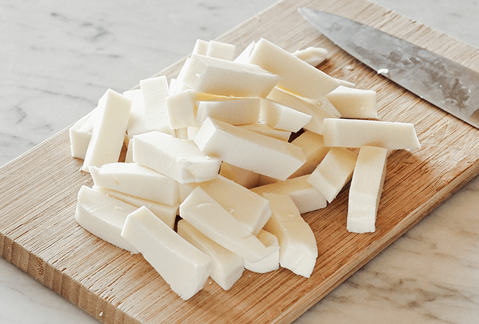 While waiting for the water to come to temperature, prepare your mozzarella and cream for action! Slice mozzarella into even strips to ensure they melt evenly and place into a heat-proof bowl. Pour cream into a second bowl.