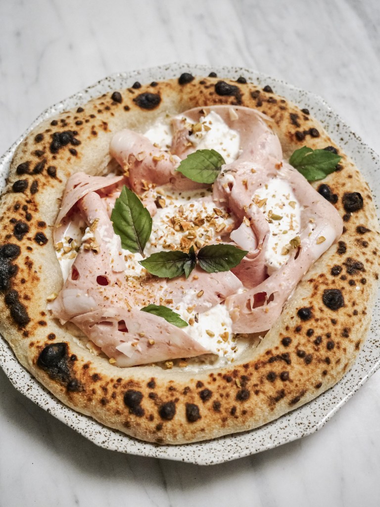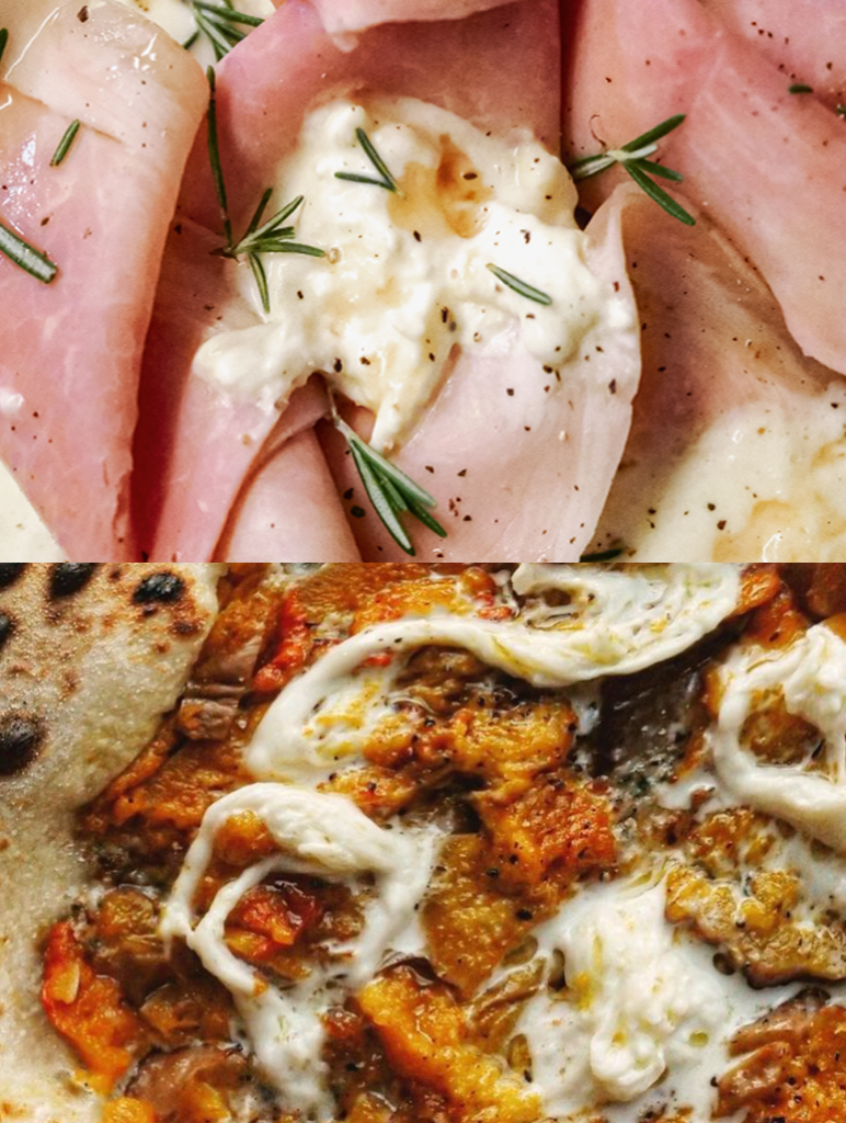 I looove putting stracciatella on post-bake for that luscious, silky texture – basically how you’d use a burrata on pizza, BUT it also works great as the base for a pizza bianca (white pizza). A lot of white pizze have a base of mozz which is great in most situations but stracciatella is more tender (less chewy) as a base. This works well when you are trying to highlight the textures from the other toppings instead of mozz stealing the show with it’s cool, stringy cheese pulls. Both work, no shade on mozz, just depends on the effect you’re trying achieve. 🙂