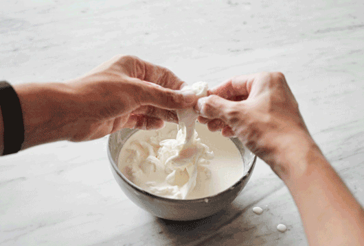 Transfer your blobby-rope of mozzarella into the bowl of cold cream. Tear the mozzarella into strands. You can make your strands long or short – up to you!